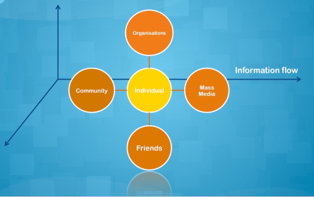 Let’s take a step beyond the existing models. In the social media age of today, the transactional model surely remains valid, as we continue to influence each other, but a z axis is added to x and y as players start occupying a place in space that allows them to interact in any way with all other players and play all roles at the same time, depending on the perspective. The individual is empowered by social media to become an opinion leader, a gate-keeper of his own and influence its own community. He becomes a source of news for his community and sometimes for the traditional media themselves. He is approached directly by organisations and approaches them directly. The individual is simultaneously consumer, producer, evaluator and influencer. He has the power.